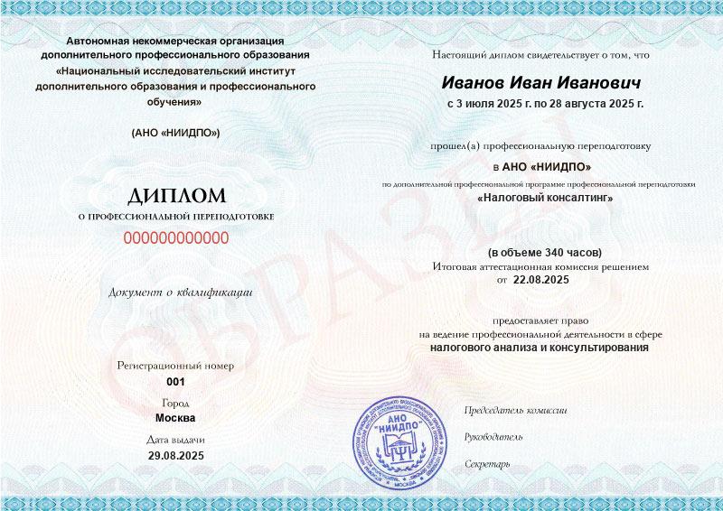 После сдачи экзамена выдается диплом о дополнительном профессиональном образовании. Присваивается квалификация «Налоговый консультант».