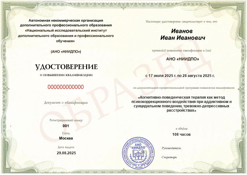 Курс Когнитивно-поведенческая терапия как метод психокоррекционного воздействия при аддиктивном и суицидальном поведении, тревожно-депрессивных расстройствах (108ч)