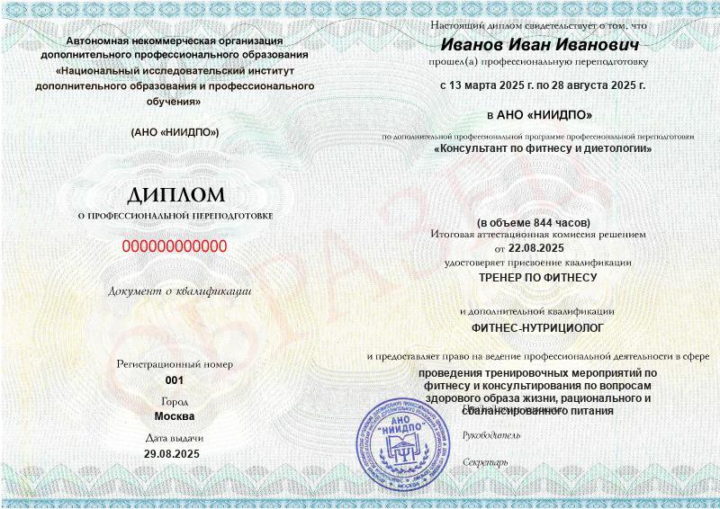Вы получите сразу две квалификации: фитнес-тренера и консультанта по питанию, что существенно расширяет ваши профессиональные возможности и востребованность на рынке.