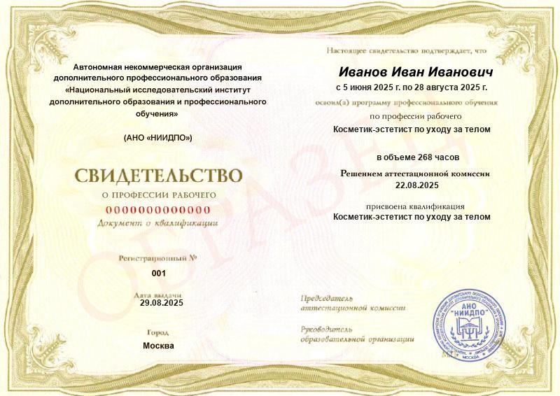 • Квалификация: Косметик-эстетист по уходу за телом