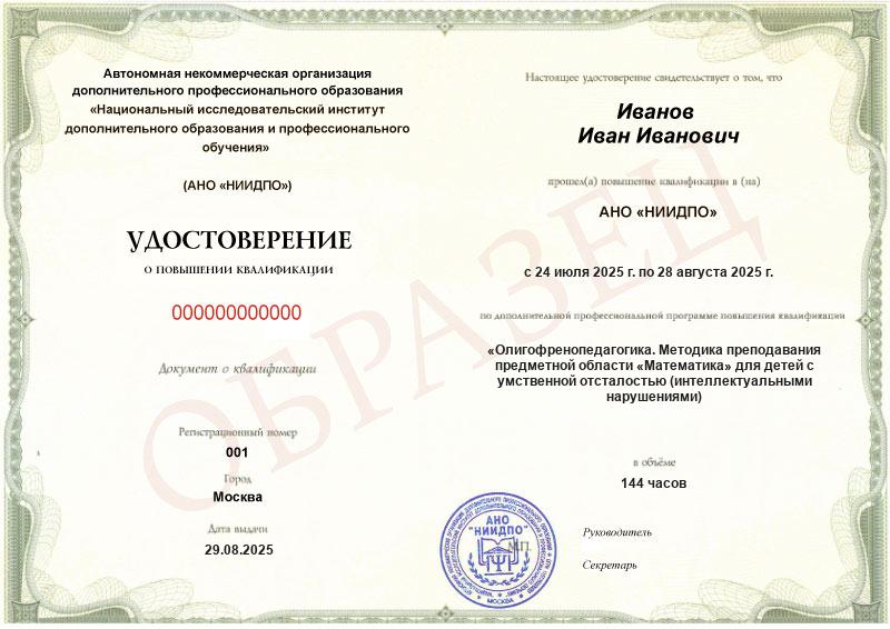 Олигофренопедагогика. Методика преподавания предметной области «Математика» для детей с умственной отсталостью (интеллектуальными нарушениями) в условиях реализации ФГОС (144ч)