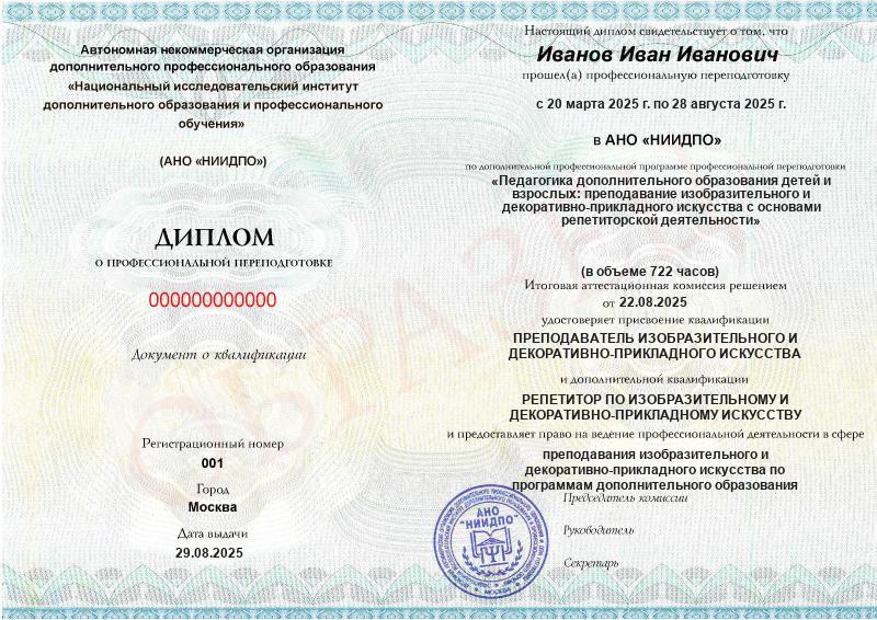 - 2 квалификации: Преподаватель изобразительного и декоративно-прикладного искусства + Репетитор по изобразительному и декоративно-прикладному искусству