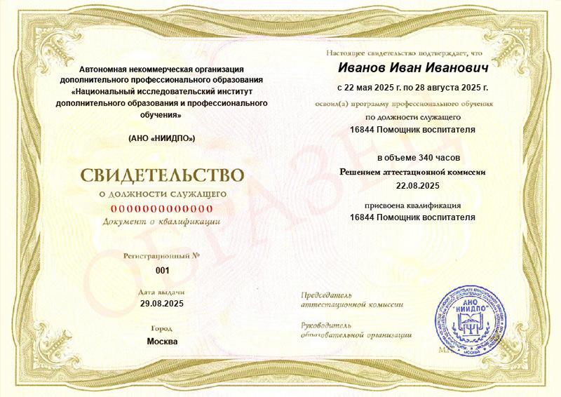 - Квалификация: 16844 Помощник воспитателя