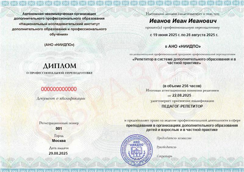 Студент, желающий поступить в АНО «НИИДПО», должен предоставить справку из образовательной организации. Независимо от срока окончания обучения по программе дополнительного образования, диплом о профпереподготовке выдаётся только после предъявления документа о получении среднего профессионального или высшего образования.