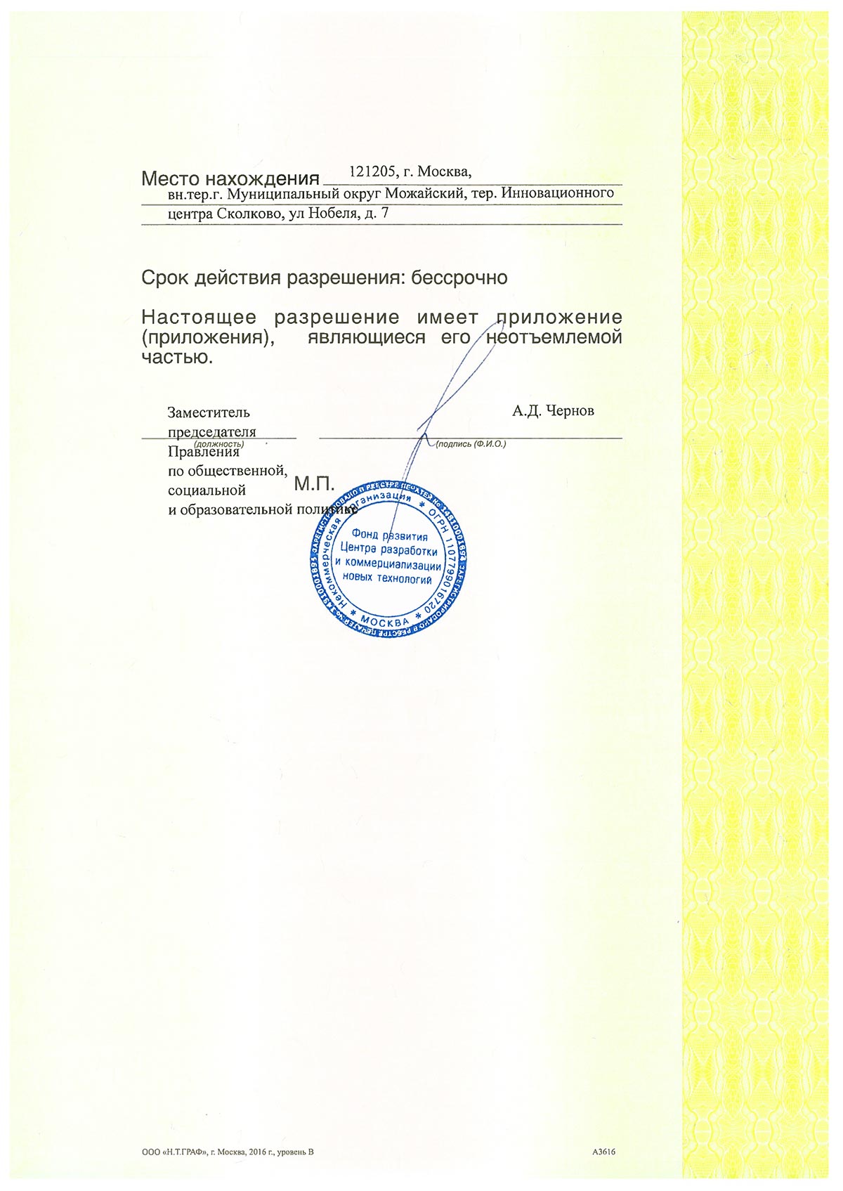 Разрешение на осуществление образовательной деятельности на территории инновационного центра «Сколково» № 042 от 22 сентября 2025 г.