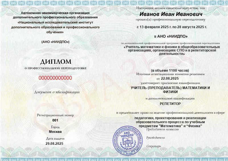 - 2 квалификации: Учитель (преподаватель) математики и физики + Репетитор