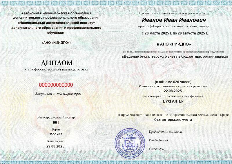 • Диплом с присвоением квалификации бухгалтера по программе дополнительного профессионального образования «Ведение бухгалтерского учета в бюджетных организациях»